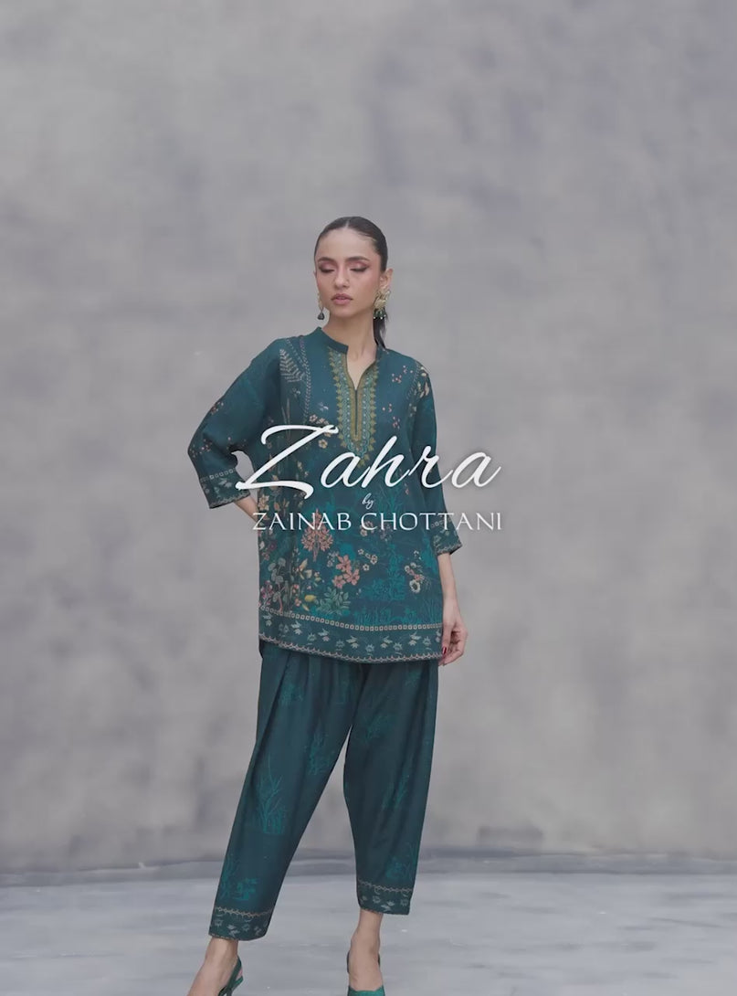 Your new winter obsession is here. The Mystic Garden Co-Ord is giving dreamy, earthy vibes you need. Crafted from soft-touch viscose in a deep teal, it’s covered in a stunning, muted botanical print. The relaxed top and slouchy shalwar are the ultimate comfy flex.
