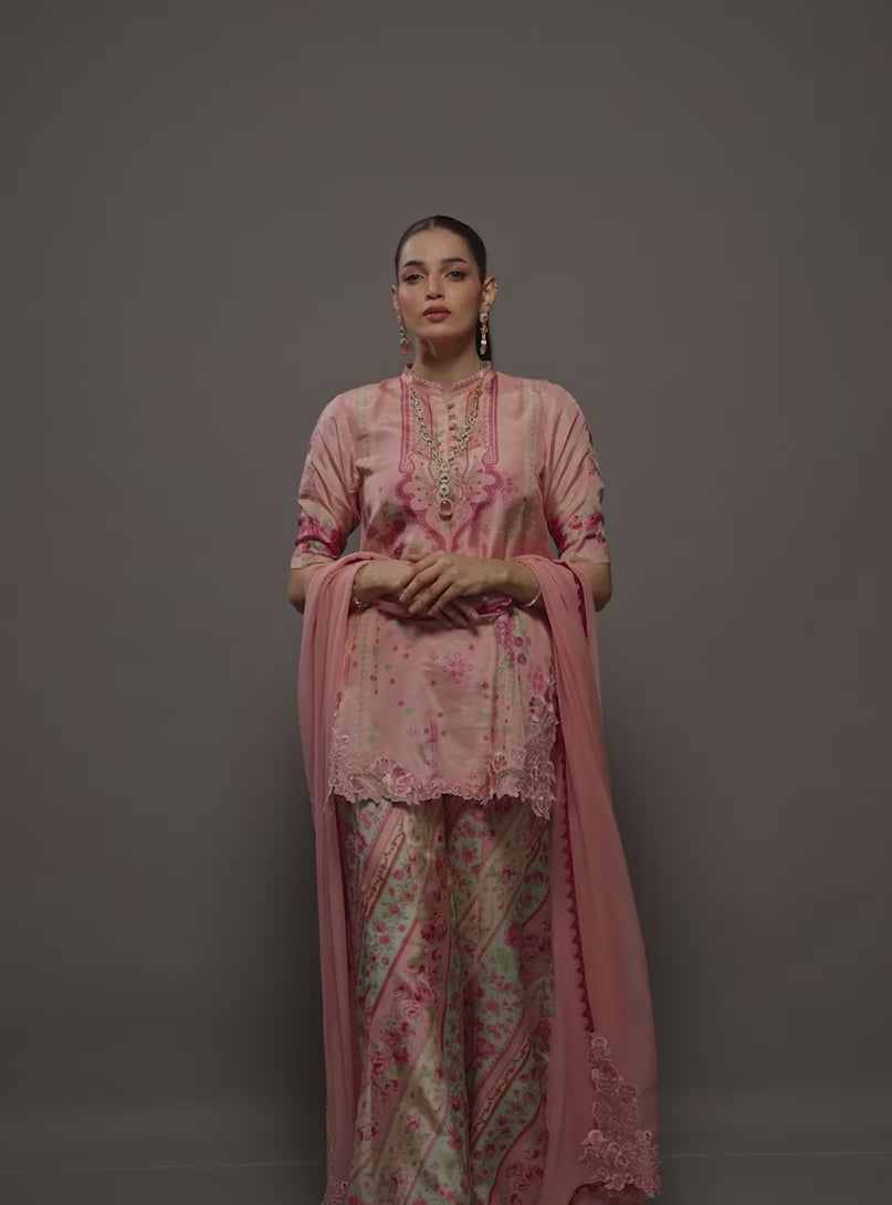 This exquisite ensemble is a masterclass in contemporary luxury, featuring a short-length shirt meticulously crafted from pure raw silk. The shirt is adorned with a delicate botanical print in ethereal shades of blush pink and sky blue, complemented by a scalloped, hand-embroidered hemline that adds a layer of artisanal texture. It is paired with striking flared pants in a coordinating floral pattern. Completing the look is a lightweight, monochromatic chiffon dupatta that adds an airy, romantic finish to the pastel palette.