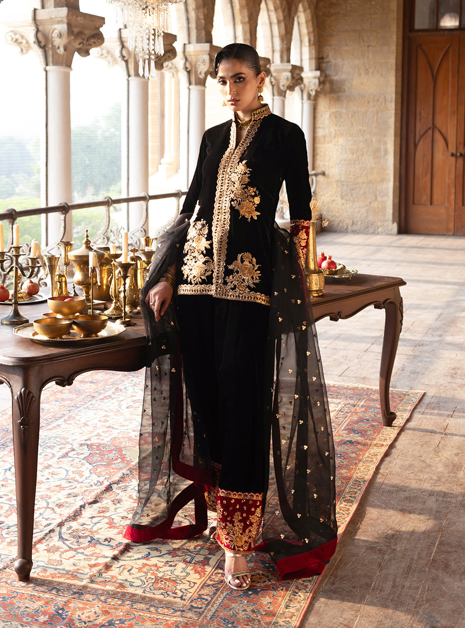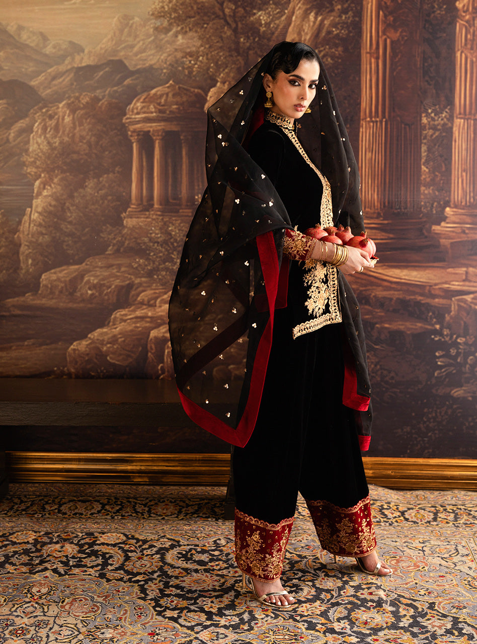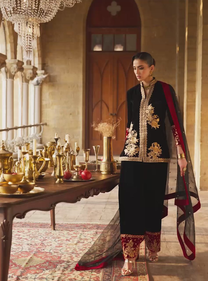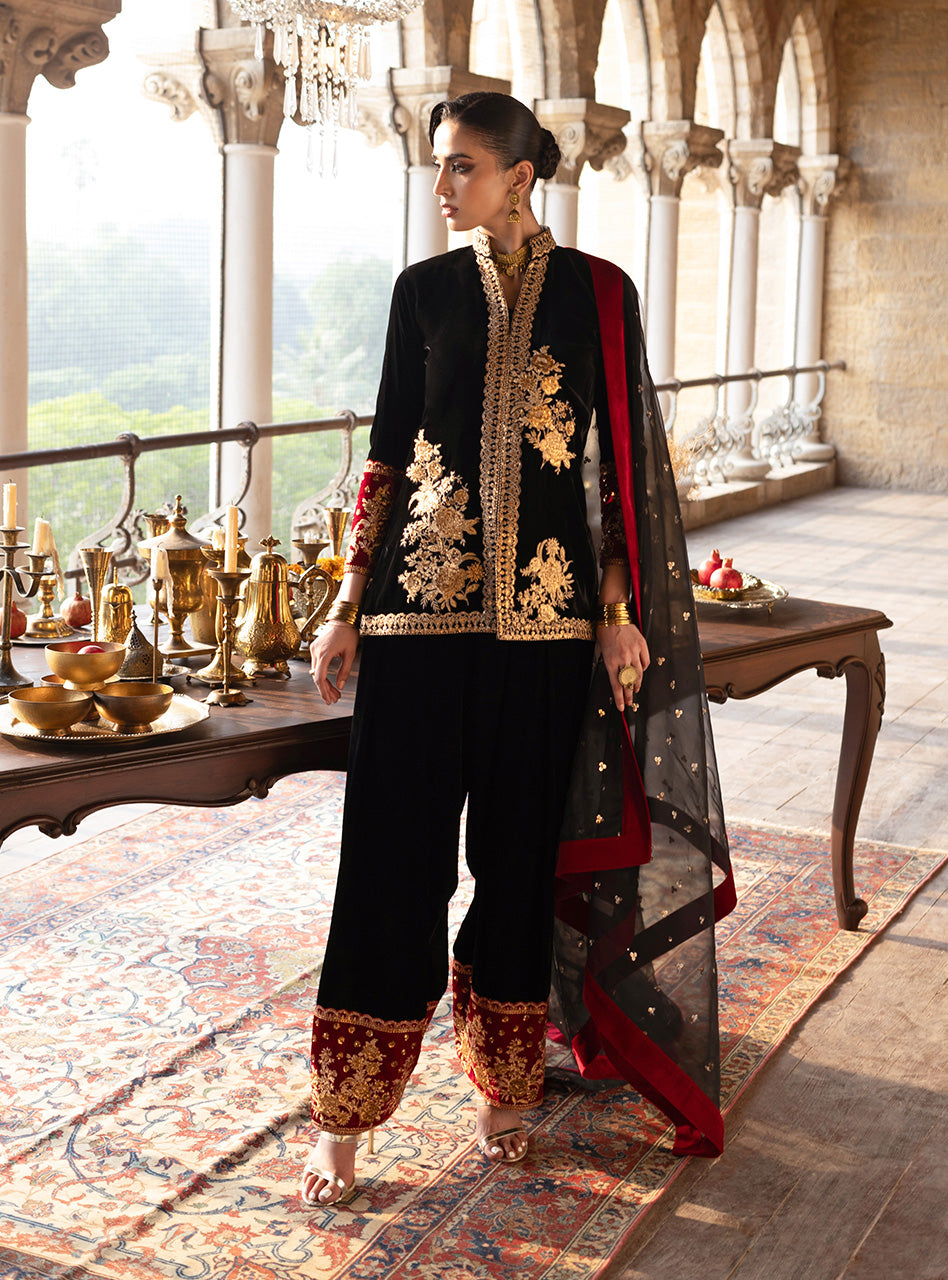 Experience true festive grandeur in Vian Farshi, a majestic ensemble crafted from luxurious Black velvet featuring a contemporary short-jacket silhouette. This captivating piece is exquisitely detailed with dense gold embroidery that lavishly covers the front and forms an ornate floral pattern on the back. The outfit introduces a rich contrast with red velvet borders at the cuffs and trouser hem, which are themselves heavily embellished with fine gold work. Paired with farshi velvet shalwar and a sheer black organza dupatta scattered with subtle sequin details.