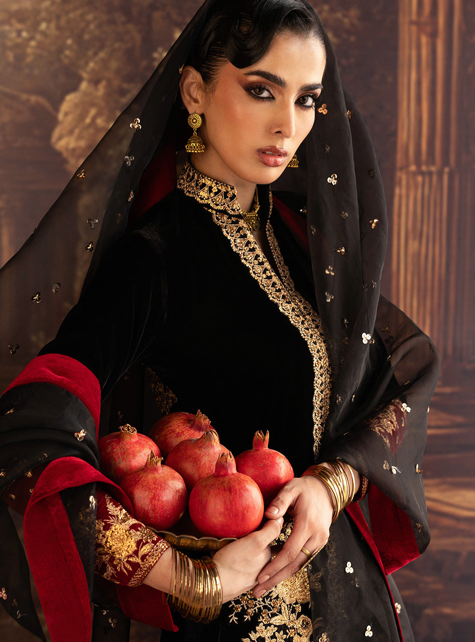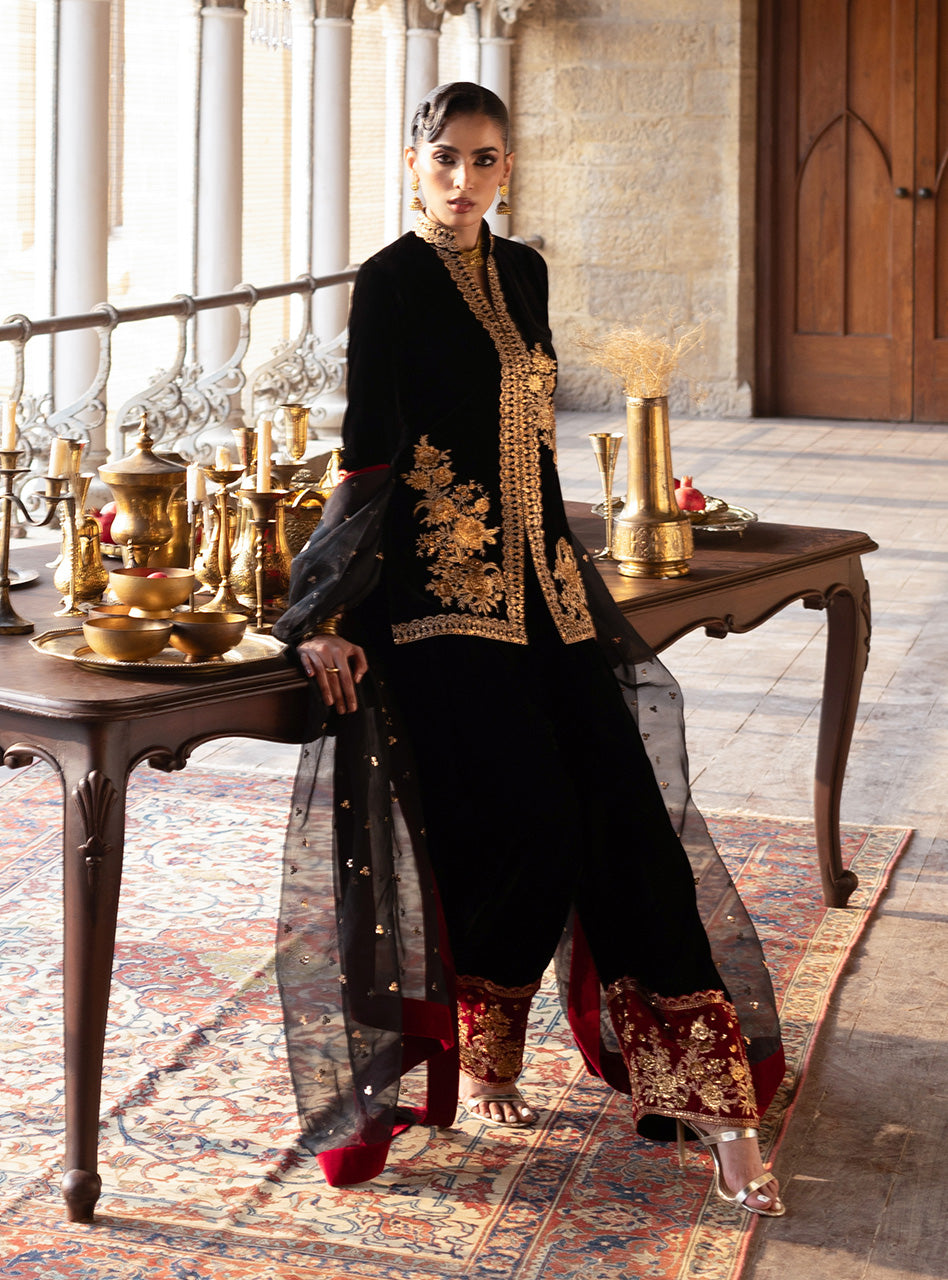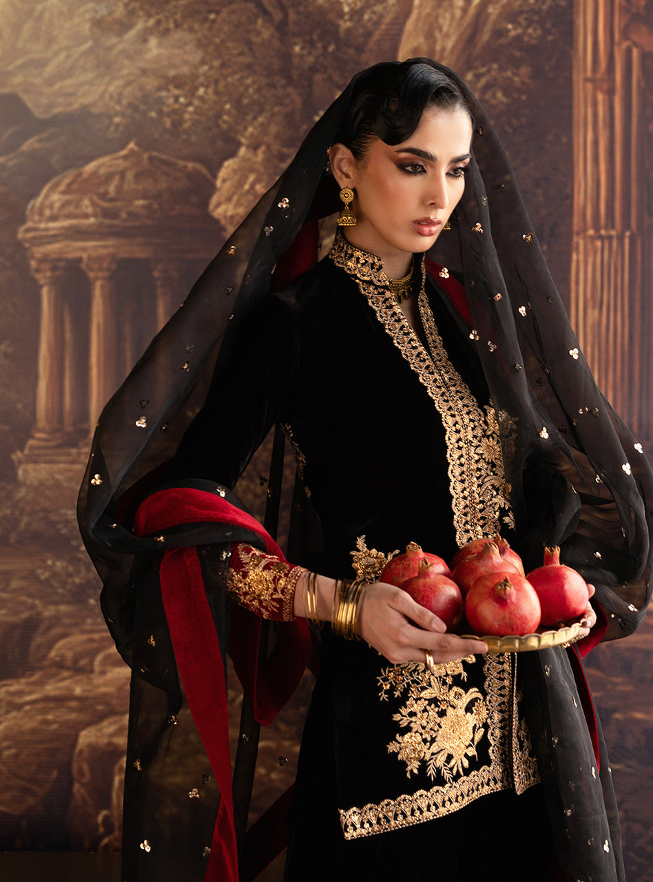 Experience true festive grandeur in Vian Farshi, a majestic ensemble crafted from luxurious Black velvet featuring a contemporary short-jacket silhouette. This captivating piece is exquisitely detailed with dense gold embroidery that lavishly covers the front and forms an ornate floral pattern on the back. The outfit introduces a rich contrast with red velvet borders at the cuffs and trouser hem, which are themselves heavily embellished with fine gold work. Paired with farshi velvet shalwar and a sheer black organza dupatta scattered with subtle sequin details.