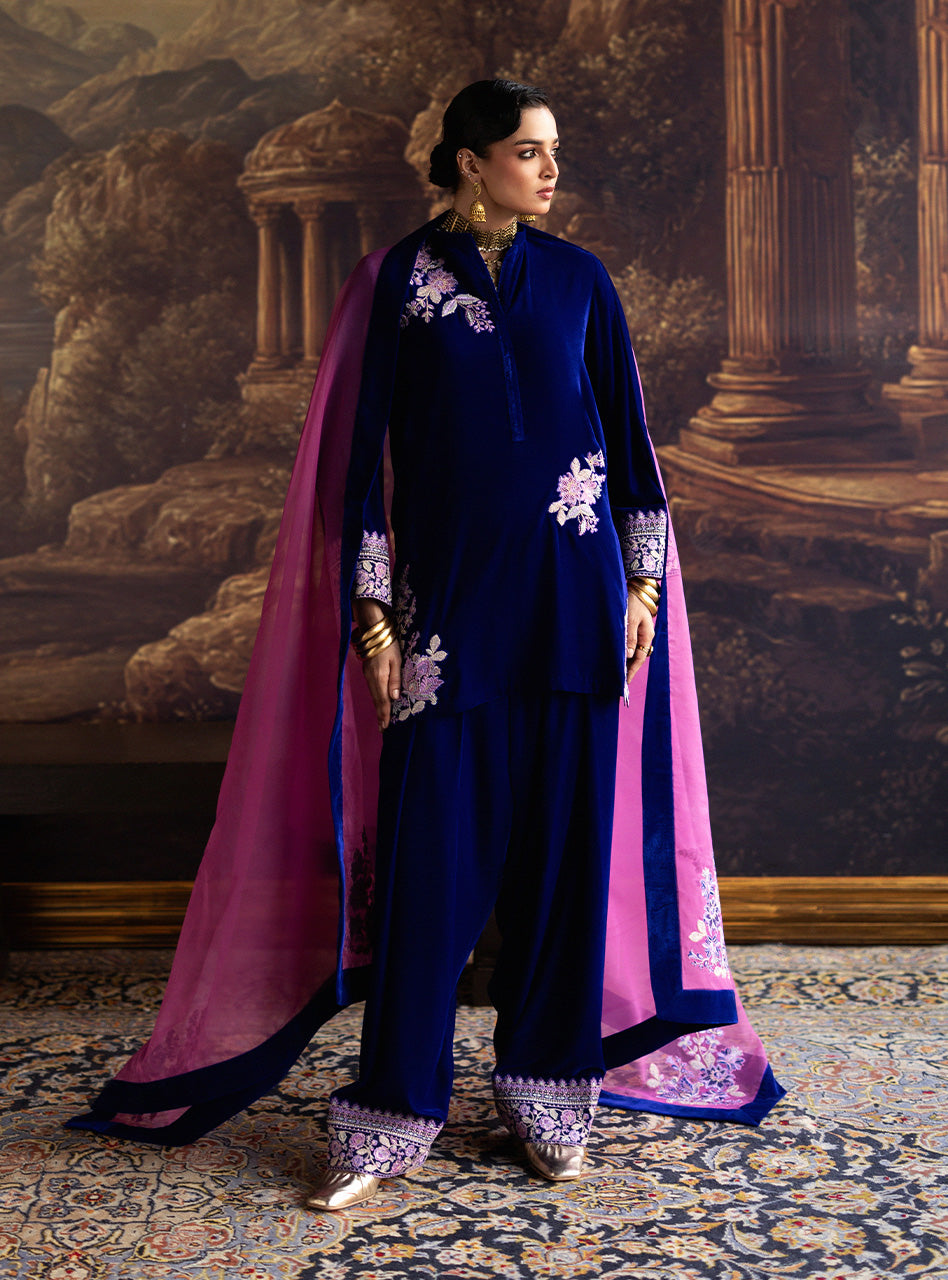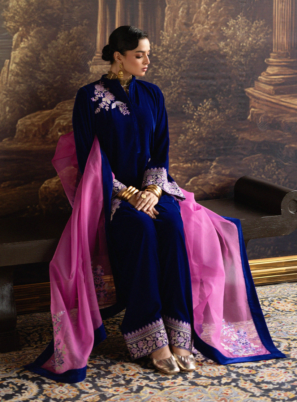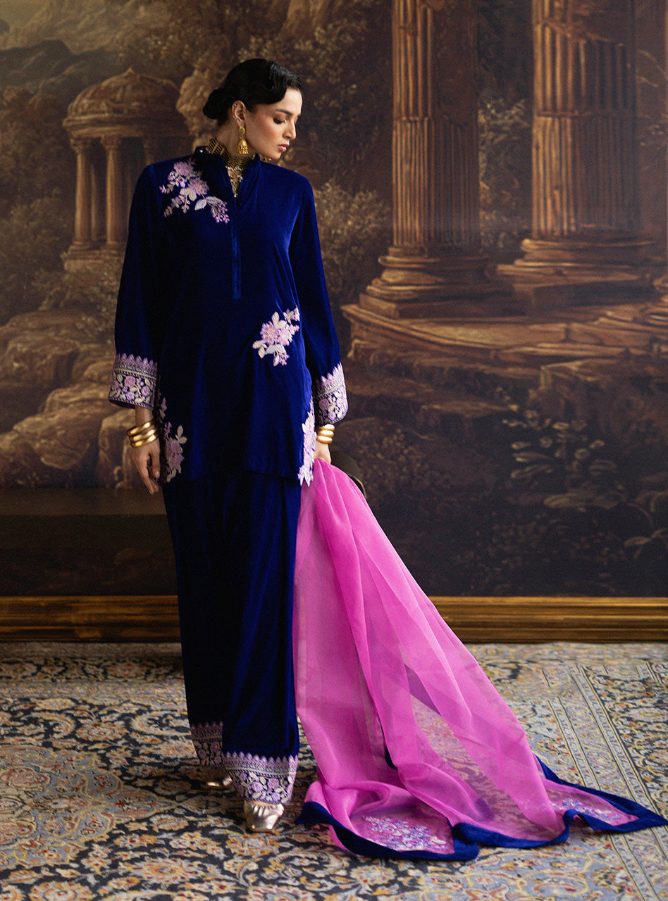 This ensemble makes you feel incredibly chic and effortlessly radiant, crafted from the most exquisite Deep Cobalt Blue Velvet that drapes with an elegant, flattering flow. The richness of the velvet is beautifully illuminated by delicate silver and pink floral embroidery, artfully scattered across the kurta and sleeves, giving it a soft, ethereal touch. But it's the breathtaking Pink Organza dupatta that truly sets the mood. its sheer beauty and vibrant hue create a stunning, playful contrast, making you feel both sophisticated and undeniably joyful.