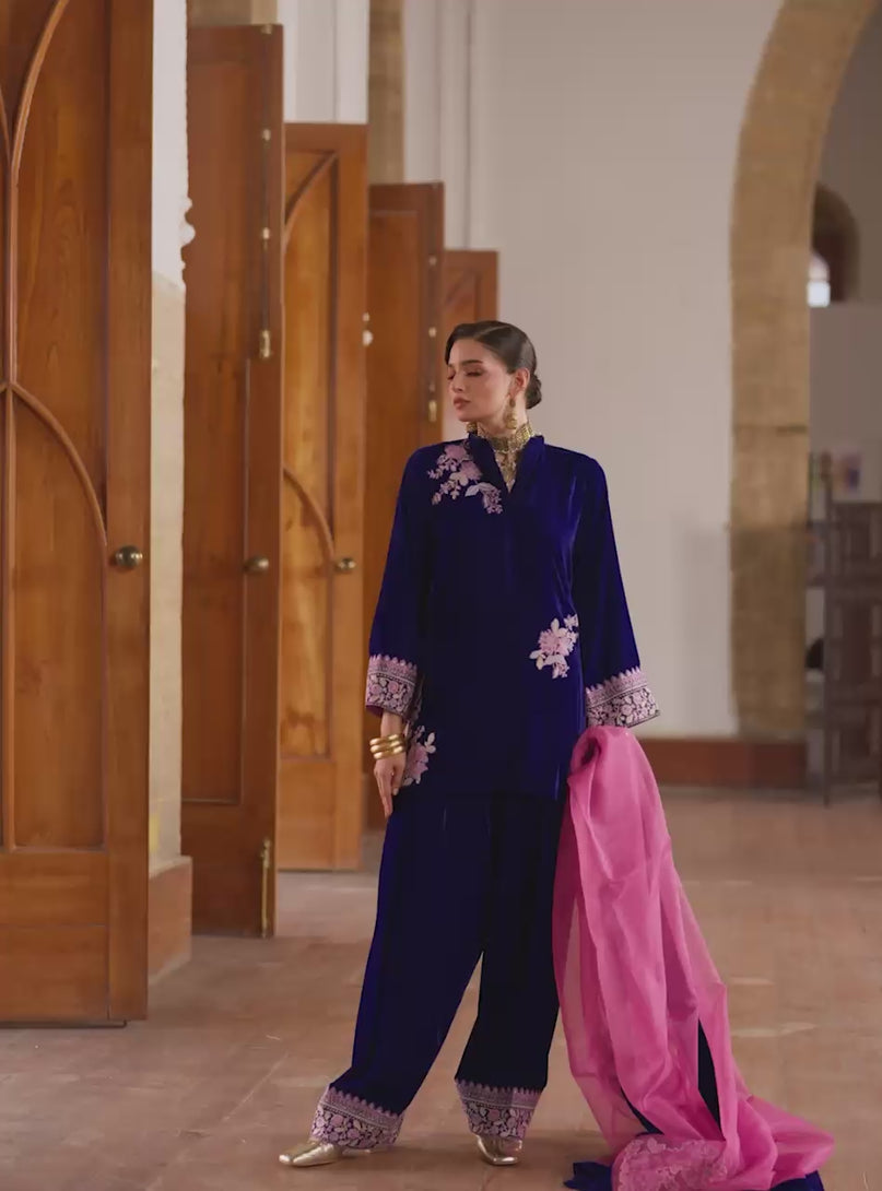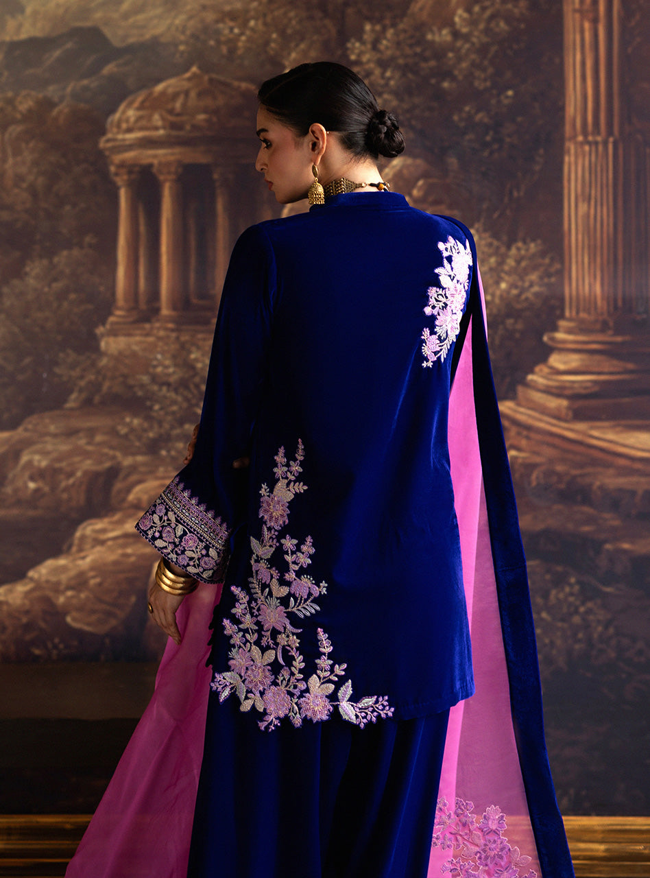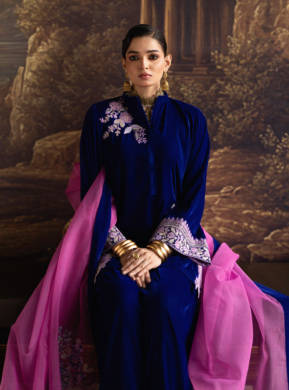 This ensemble makes you feel incredibly chic and effortlessly radiant, crafted from the most exquisite Deep Cobalt Blue Velvet that drapes with an elegant, flattering flow. The richness of the velvet is beautifully illuminated by delicate silver and pink floral embroidery, artfully scattered across the kurta and sleeves, giving it a soft, ethereal touch. But it's the breathtaking Pink Organza dupatta that truly sets the mood. its sheer beauty and vibrant hue create a stunning, playful contrast, making you feel both sophisticated and undeniably joyful.