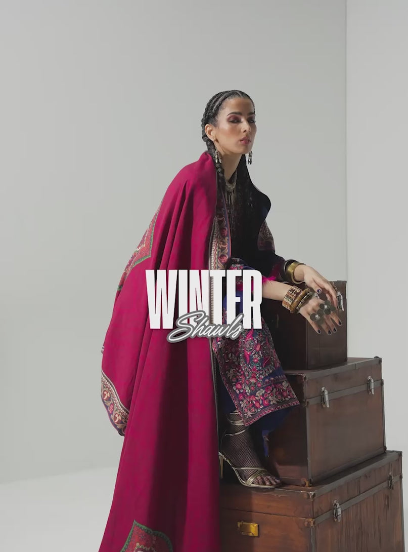 Vilana stands as the crowning jewel of the collection, a magnificent study in rich, contrasting heritage colors. The deep indigo-navy Marina Twill suit provides a sophisticated, midnight canvas, beautifully illuminated by the dramatic accents of fuchsia and elaborate embroidery. The focal point is the exquisite Lenzing Ecovero shawl, which is a tapestry of complex paisley patterns in tones of deep crimson, plum, and olive, providing unparalleled depth and luxury.