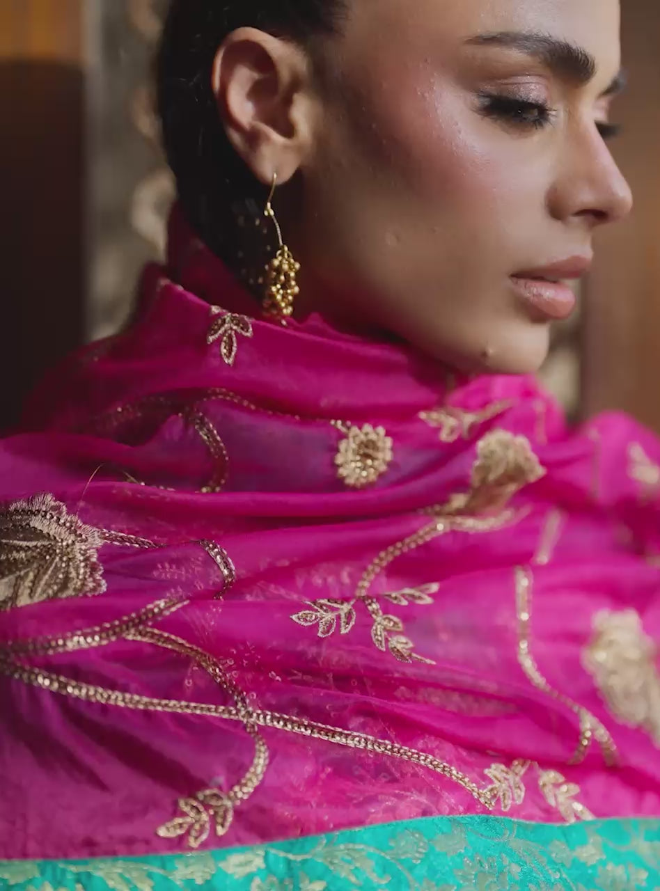 A classic and dramatic unstitched ensemble in bold Black Velvet. The shirt is richly embellished with intricate multicolored thread-work embroidery on the neckline, sleeves, and borders, creating a striking contrast. It is crowned with a dazzling Hot Pink Organza Dupatta, finished with a bold turquoise border and delicate embroidery for an unforgettable statement.