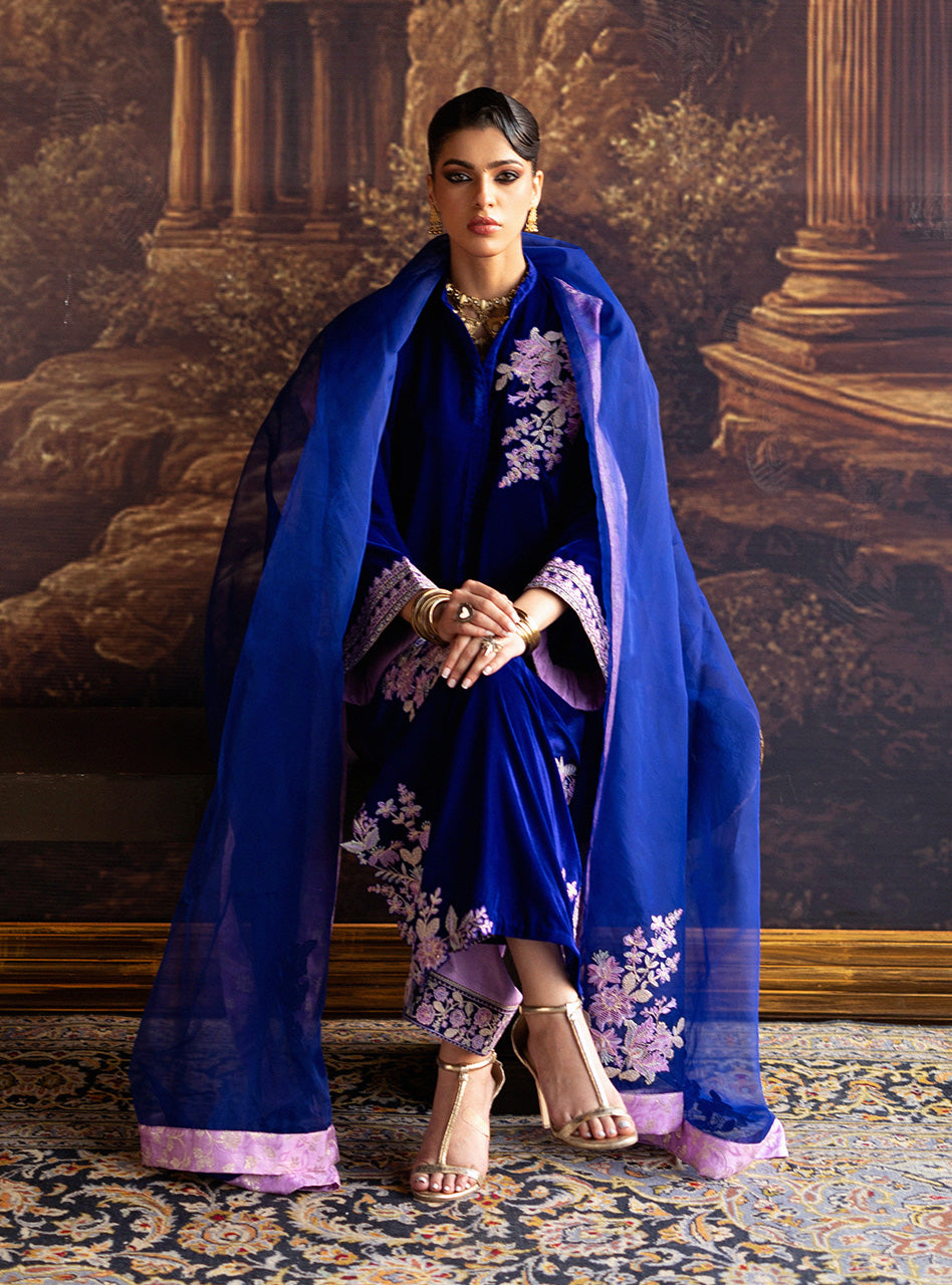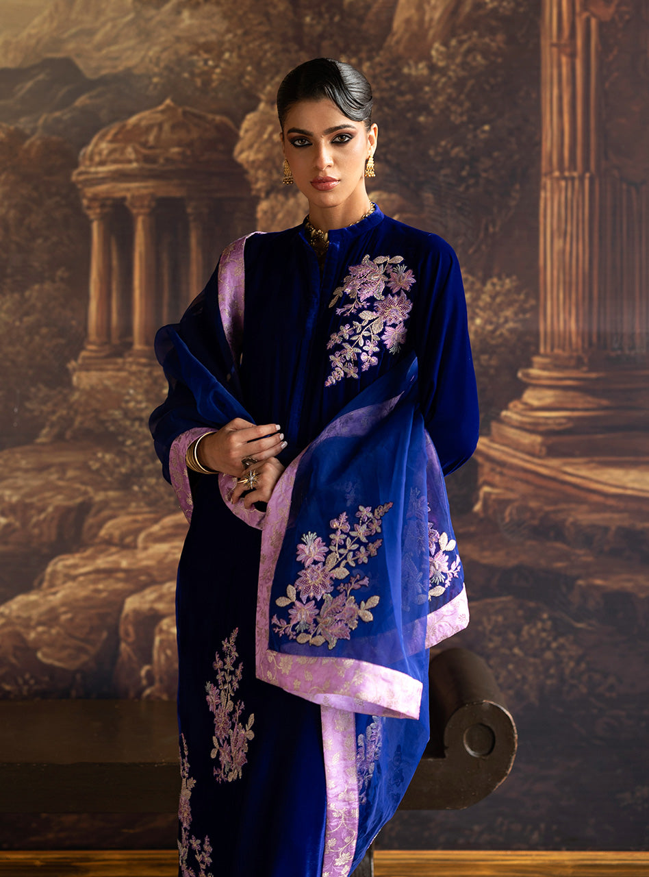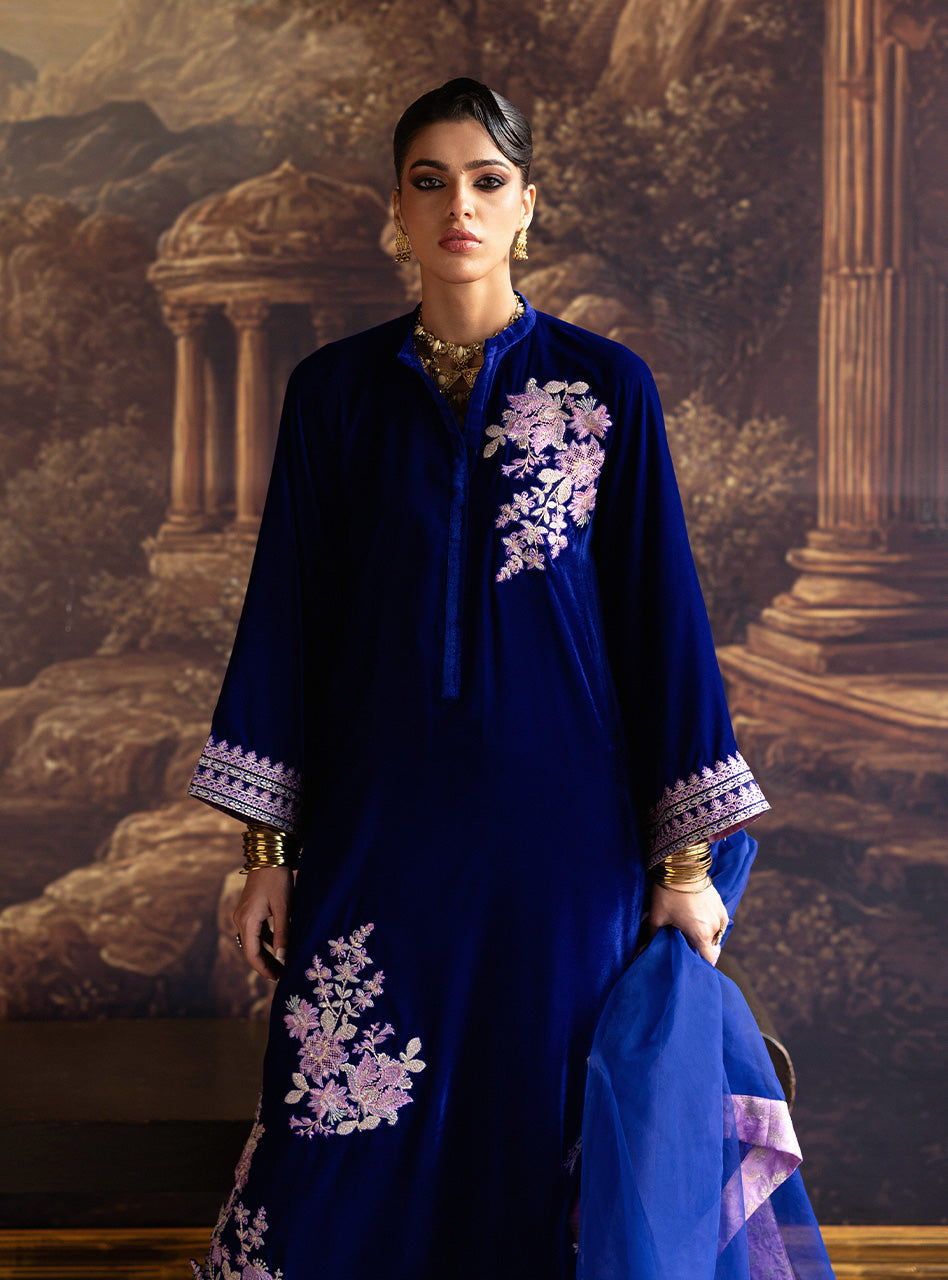 This stunning ensemble, featuring a straight-cut kurta crafted from rich Cobalt Blue velvet. The kurta is delicately adorned with beautiful pink and lilac thread-work embroidery, featuring intricate floral motifs that gracefully climb the side panels and frame the cuffs. This luxurious outfit is perfectly paired with raw silk trousers, which showcase coordinating embroidery along the hemline to complete the tailored look. The set is finished with a sophisticated sheer blue dupatta, elegantly bordered with a contrasting pink edge and subtle embroidered details.