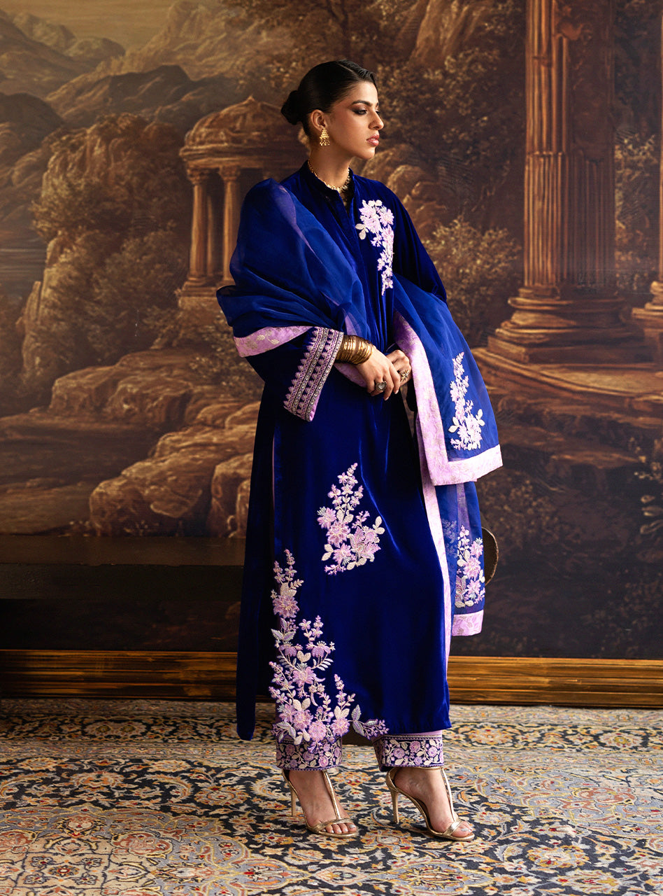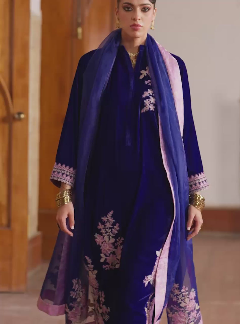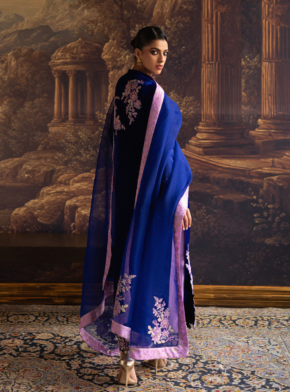 This stunning ensemble, featuring a straight-cut kurta crafted from rich Cobalt Blue velvet. The kurta is delicately adorned with beautiful pink and lilac thread-work embroidery, featuring intricate floral motifs that gracefully climb the side panels and frame the cuffs. This luxurious outfit is perfectly paired with raw silk trousers, which showcase coordinating embroidery along the hemline to complete the tailored look. The set is finished with a sophisticated sheer blue dupatta, elegantly bordered with a contrasting pink edge and subtle embroidered details.