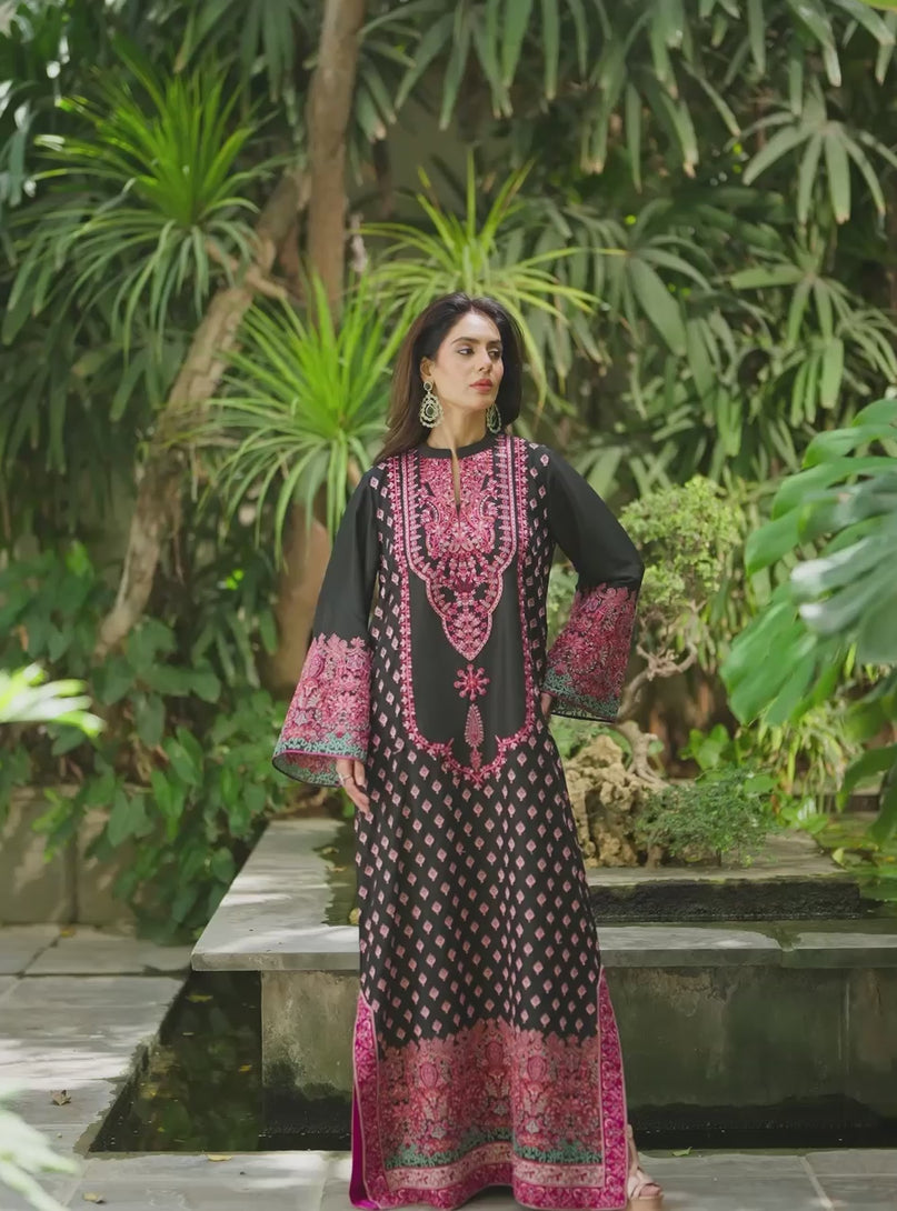 This floor-length black kaftan is a masterclass in regal fusion, featuring a structured silhouette with dramatic, flared sleeves that lend an air of effortless grace. The ensemble is defined by its intricate Persian-inspired embroidery, showcasing a rich palette of deep crimson, dusty rose, and subtle sage green threads. A meticulous banquet of floral and geometric motifs adorns the neckline in a shield-like pattern, cascading down into a repetitive diamond-trellis stitch across the body. The wide sleeves and the expansive hemline are finished with heavy, ornate borders that ground the airy fabric, making it a standout piece for a festive evening.